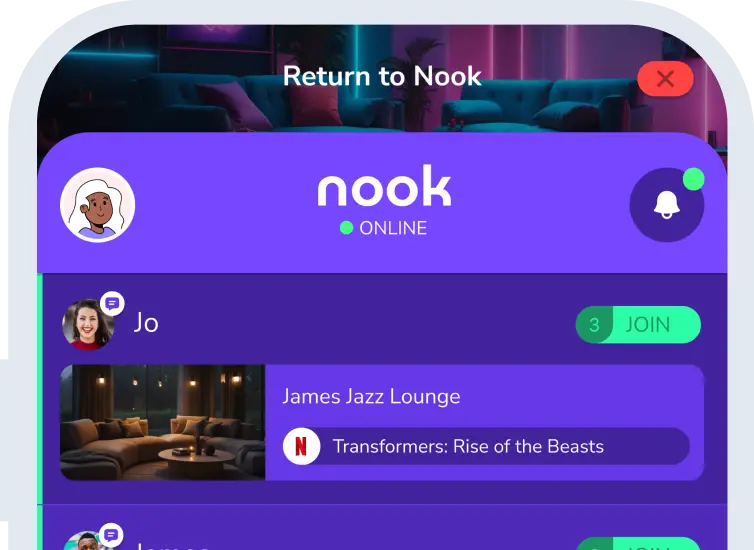 Create a Nook to stream with friends or join one that’s already going. Perfect for movie nights, binge sessions, or just hanging out.